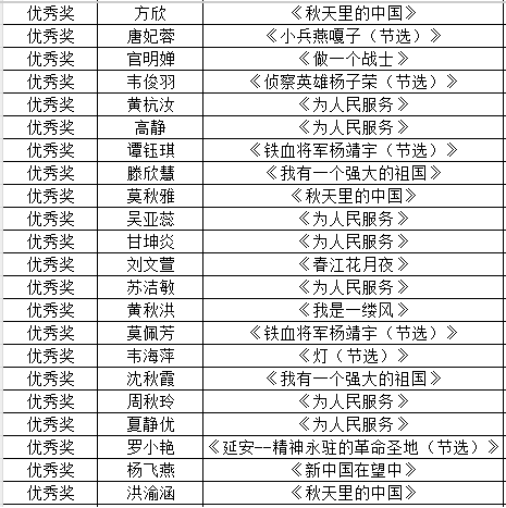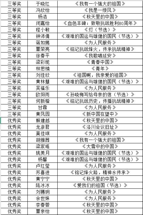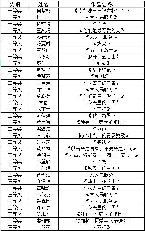 本次校内选拔赛共收到246个朗诵作品。根据综合评选及参赛总人数,共评选校内一等奖8名、二等奖18名、三等奖26名、优秀奖37名,具体名单公布如下: