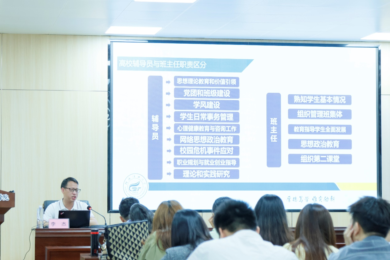 为深入学习贯彻党的二十大精神,进一步落实立德树人根本任务,持续加强PP电子学生工作队伍建设,5月24日,PP电子举办2023年春季学期辅导员、班主任培训讲座。本次讲座邀请了桂林理工大学南宁分校机械系副书记李杰担任主讲人,学工处全体成员、全校辅导员、班主任共45人参加培训。