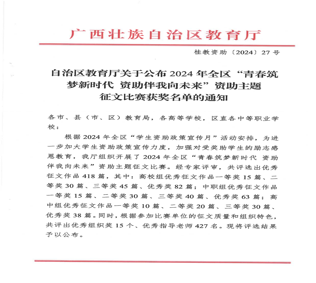 为贯彻落实《自治区教育厅关于开展2024年全区“学生资助政策宣传月”活动的通知》(桂教资助〔2024〕7号)文件精神,PP电子在全校范围内举办了以“青春筑梦新时代 资助伴我向未来”为主题的资助征文比赛。比赛遵循优中选优的原则,经过组织推荐和评选,选送两篇优秀作品至自治区教育厅参赛。最终,人工智能学院苏康俐同学的《筑梦飞翔——资助扶我青云志》荣获三等奖,海洋与渔业学院陆冠杰同学的《心怀感恩之心 助力民族复兴》荣获优秀奖。