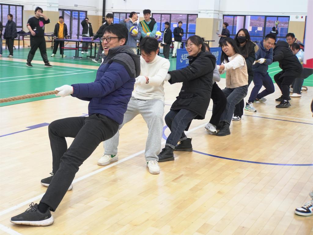 本次比赛共有4支行政队和8支学院队参赛,采取分组淘汰制方式进行。拔河比赛现场,随着裁判员的哨响,拔河比赛开始,选手们双手紧握绳子,铆足了劲往后拉,场边的观众热情高涨,纷纷为各参赛队伍呐喊助威。