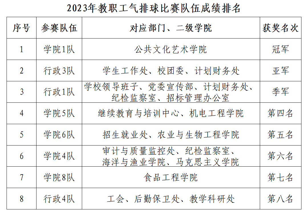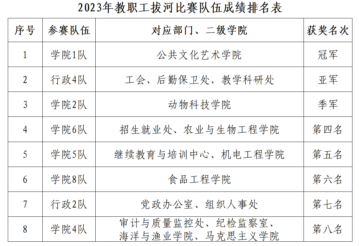 经过激烈的角逐,学院1队获得拔河比赛冠军,行政4队获得亚军,学院2队获得季军;学院1队获得气排球比赛冠军,行政3队获得亚军,行政1队获得季军。