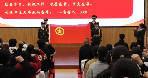 在入团宣誓环节,由优秀团员代表领誓,全体团员面向团旗,右手握拳,庄严宣誓。