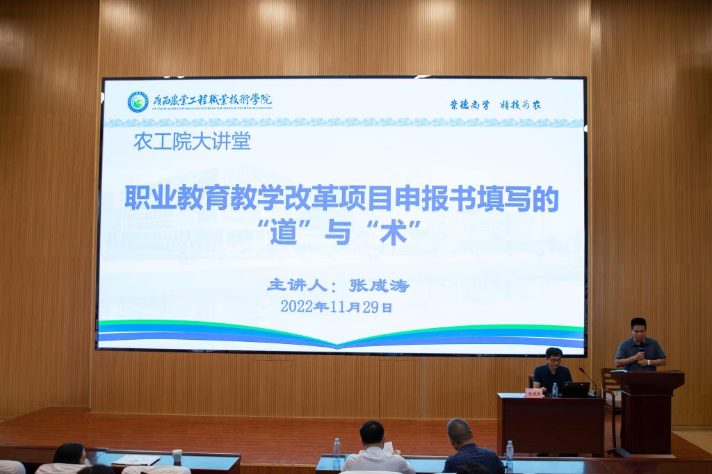 11月29日,PP电子举办了第九期农工院大讲堂,本期大讲堂邀请到南宁师范大学副教授张成涛作为主讲老师,以《职业教育教学改革项目申报书填写的“道”与“术”》为题。学校党委副书记、纪委书记章红平出席讲座。张教...
