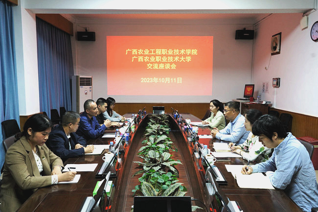 10月11日,学校党委副书记、纪委书记章红平带领组织人事处一行5人前往广西农业职业技术大学人事处开展交流学习。广西农业职业技术大学党委副书记陈信存、人事处相关领导参加了本次交流会。交流会上,双方就党建工...